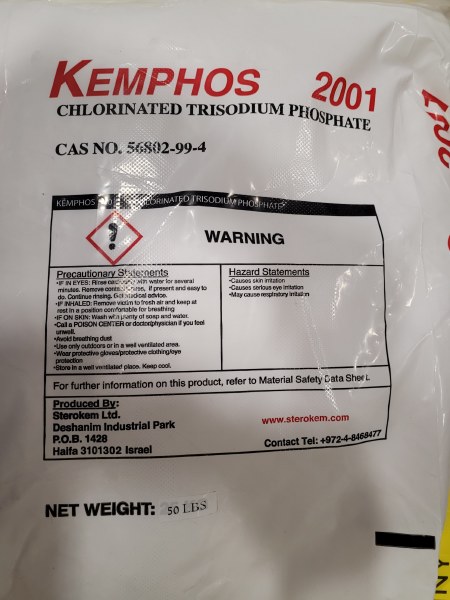 Chlorinated TSP is used for sanitation of stainless steel items, floors and most plastics, the typical dosage is 1 cup per 5 gallons and must be rinsed with a citric acid solution to neutralize the residue.